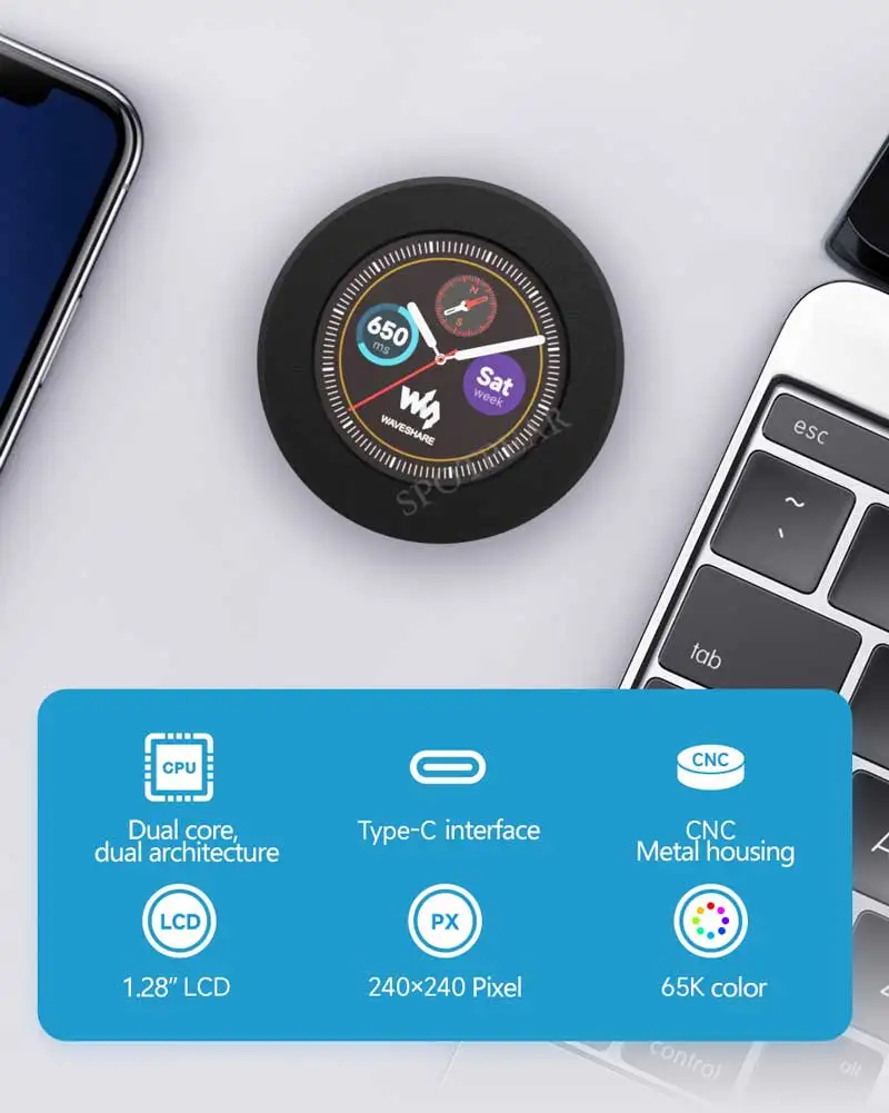 This product is a low-cost, high-performance microcontroller development board designed by Spotpear. In a small form factor, it is equipped with a 1.28-inch LCD round screen, a lithium battery charging chip, and six-axis sensors (three-axis acceleration and three-axis gyroscope) and other peripherals, and all GPIO and Debug interfaces are brought out to facilitate development and embedding applications into products.